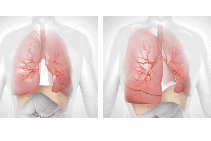 Καταστρέφονται σταδιακά οι μικρές μονάδες αναπνοής. Έτσι λοιπόν, οι πνεύμονες φουσκώνουν σαν μεγάλος σάκος, όπως βλέπουμε στις φωτογραφίες και πιέζουν τα όργανα του θώρακα, όπως επίσης δεν αφήνουν τα καλά τμήματα του πνεύμονα να «πάρουν βαθιά αναπνοή».