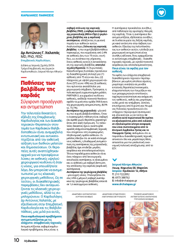 Την τελευταία δεκαετία η εξέλιξη της Επεμβατικής Καρδιολογίας και των Διακαθε- τηριακών Θεραπειών στον τομέα των Καρδιακών Βαλβι- δοπαθειών είναι αναμφίβολα εντυπωσιακή και αντικατο- πτρίζεται από την εκθετική αύξηση των διεθνών μελετών και δημοσιεύσεων. Οι θερα- πείες αυτές αναπτύχθηκαν αρχικά για να προσφέρουν λύσεις σε ασθενείς υψηλού χειρουργικού κινδύνου ή όταν η νόσος, για οποιοδήποτε λόγο, δεν μπορούσε να αντιμε- τωπιστεί με τις κλασικές χειρουργικές μεθόδους. Ως εκ τούτου, οι διακαθετηριακές παρεμβάσεις δεν ανταγωνί- ζονται τις κλασικές χειρουρ- γικές μεθόδους, αλλά τις συ- μπληρώνουν. Ο Καρδιολόγος Δρ Αντώνιος Χαλαπάς, με εξειδίκευση στην Επεμβατική Καρδιολογία και τις Βαλβιδο- πάθειες, μας μιλά για αυτές.