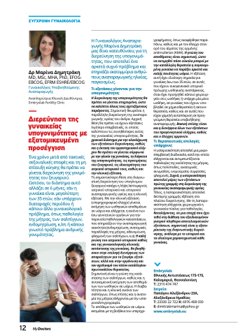 Η Γυναικολόγος Αναπαρα- γωγής Μαρίνα Δημητράκη μας δίνει κατευθύνσεις για τη διερεύνηση της υπογονιμό- τητας, που αποτελεί ένα αρκετά συχνό πρόβλημα και επηρεάζει εκατομμύρια ανθρώ- πους αναπαραγωγικής ηλικίας, παγκοσμίως.