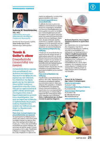 Η επικονδυλίτιδα του αγκώνα είναι μια φλεγμονή των τενόντων που κατά κύριο λόγο κινούν την άρθρωση του καρπού και κατ’ επέκταση των δακτύλων της άκρας χειρός και όχι του αγκώνα, όπως πολλοί πιστεύουν. Εμφανίζεται στην έξω ή έσω πλευρά του αγκώνα (tennis & golfer’s elbow, αντίστοιχα), στα σημεία όπου είναι η έκφυση (εκκίνηση) του μυοτενό- ντιου συμπλέγματος, που κινεί τον καρπό και τα δάκτυλα. Ο Ορθοπαιδικός Χειρουργός Ιωάννης Νικολόπουλος αναλύει την πάθηση και μας εξηγεί τις θεραπευτικές επιλογές της.