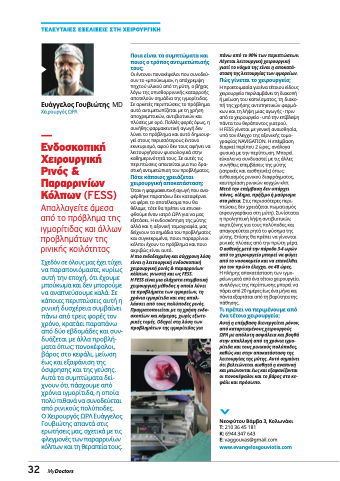 Η FESS είναι μια ελάχιστα επεμβατική χειρουργική μέθοδος η οποία λύνει τα προβλήματα των ιγμορείων, τη χρόνια ιγμορίτιδα και σας απαλ- λάσσει από τους πολύποδες ρινός. Πραγματοποιείται με τη χρήση ενδο- σκοπίων και κάμερας, χωρίς εξωτε- ρικές τομές. Οδηγεί στη λύση των προβλημάτων της ιγμορίτιδας για