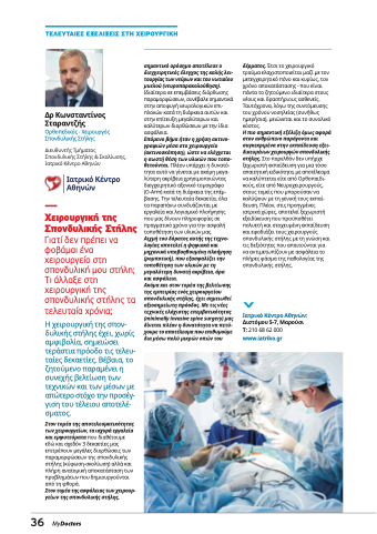 Η χειρουργική της σπον- δυλικής στήλης έχει, χωρίς αμφιβολία, σημειώσει τεράστια πρόοδο τις τελευ- ταίες δεκαετίες. Βέβαια, το ζητούμενο παραμένει η συνεχής βελτίωση των τεχνικών και των μέσων με απώτερο στόχο την προσέγ- γιση του τέλειου αποτελέ- σματος.
