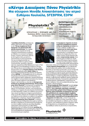 Το "Κέντρο Διαχείρισης Πόνου Physiatriki", ως Κέντρο Αποκατάστασης και Αποθεραπείας λειτουργεί ως πρότυπη Μονάδα, με εξειδίκευση στη Διεπιστημονική διαχείριση του πόνου. Διαθέτει ποικίλες και καινοτόμες θεραπείες, σχεδιασμένες εξατομικευμένα για κάθε ασθενή. Διευθύνεται από τον Ευθύμιο Κουλούλα, φυσίατρο και ειδικό ιατρό πόνου και άρτια εκπαιδευμένους θεραπευτές, όπως φυσικοθεραπευτή, εργοθεραπευτή, διαιτολόγο, κοινωνική λειτουργό, ψυχολόγο.