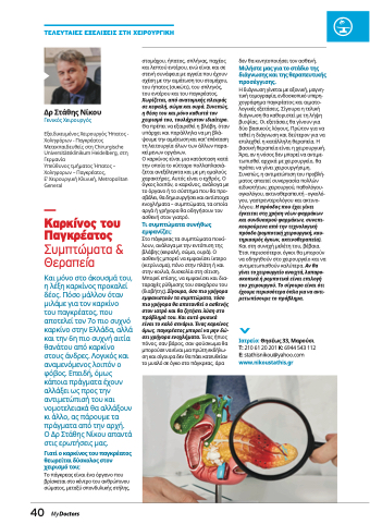 Η διάγνωση γίνεται με αξονική, μαγνη- τική τομογραφία, ενδοσκοπικό υπερη- χογράφημα παγκρέατος και αιματο- λογικές εξετάσεις. Σίγουρα η τελική διάγνωση θα καθοριστεί με τη λήψη βιοψίας. Οι εξετάσεις θα γίνουν για δύο βασικούς λόγους. Πρώτον για να τεθεί η διάγνωση και δεύτερον για να επιλεχθεί η κατάλληλη θεραπεία. Η βασική θεραπεία είναι η χειρουργική. Άρα, αν η νόσος δεν μπορεί να αντιμε- τωπισθεί αρχικά με χειρουργείο, θα πρέπει να γίνει χειρουργήσιμη. Συνεπώς, η αντιμετώπιση του προβλή- ματος απαιτεί συνεργασία πολλών ειδικοτήτων, χειρουργού, παθολόγου- ογκολόγου, ακτινοθεραπευτή - ογκολό- γου, γαστρεντερολόγου και ακτινο- λόγου. Η πρόοδος που έχει γίνει έγκειται στη χρήση νέων φαρμάκων και συνδυασμού φαρμάκων, συνεπι- κουρούμενα από την τεχνολογική πρόοδο (ρομποτική χειρουργική, καυ- τηριασμός όγκων, ακτινοθεραπεία). Και στη συνεχή μελέτη του, βέβαια. Έτσι περισσότεροι όγκοι θα μπορούν να οδηγηθούν στο χειρουργείο και να αντιμετωπισθούν καλύτερα. Αν θα γίνει το χειρουργείο ανοιχτά, λαπαρο- σκοπικά ή ρομποτικά είναι επιλογή του χειρουργού. Το σίγουρο είναι ότι έχουμε περισσότερα όπλα για να αντι- μετωπίσουμε το πρόβλημα.