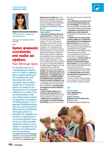 ►Ποια είναι η κατάλληλη ηλικία από- κτησης κινητού; Δεν υπάρχει κατάλ- ληλη ηλικία, όσο το αργότερο ανοίξει το κουτί της Πανδώρας, τόσο το καλύτερο. Το 2012, η μέση ηλικία απόκτησης κινητού ήταν τα 12 έτη, τώρα είναι στα 10, ενώ η πάροδος του χρόνου, σε συνδυασμό με την εξάπλωση της τεχνολογίας, ωθεί την ηλικία απόκτησης του κινητού ακόμα χαμηλότερα. Προφανώς, εξαρτάται από την ωριμότητα του παιδιού και της οικογένειας, από την εκπαίδευση και την παιδεία, για την οποία θα πρέπει να έχουν φροντίσει οι γονείς και οι εκπαιδευτικοί, όλα τα προηγού- μενα χρόνια. Η ψηφιακή εκπαίδευση, αποτελεί σύγχρονη ανάγκη, όπως και η εκπαίδευση για την αξία της πληροφορίας και της ιδιωτικότητας. Συνήθως, δεν εξαρτώνται παιδιά που ασχολούνται εποικοδομητικά με τους υπολογιστές, τον προγραμματισμό, τη ρομποτική κ.ά., αλλά όσοι ασχολού- νται αποκλειστικά με τα μέσα κοινω- νικής δικτύωσης, βιντεοπαιχνίδια κ.λπ. ►Οφείλουμε στην ομαλή λειτουργία της οικογένειας και στην υγιή ανάπτυ- ξη των παιδιών μας, από μικρή ηλικία να θεσπίζουμε κοινά και σαφή όρια και κανόνες.