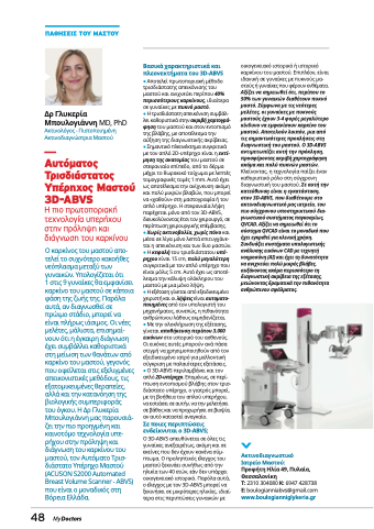 1 στις 9 γυναίκες θα εμφανίσει καρκίνο του μαστού σε κάποια φάση της ζωής της. Παρόλα αυτά, αν διαγνωσθεί σε πρώιμο στάδιο, μπορεί να είναι πλήρως ιάσιμος. Οι νέες μελέτες, μάλιστα, επισημαί- νουν ότι η έγκαιρη διάγνωση έχει συμβάλλει καθοριστικά στη μείωση των θανάτων από καρκίνο του μαστού, γεγονός που οφείλεται στις εξελιγμένες απεικονιστικές μεθόδους, τις εξατομικευμένες θεραπείες, αλλά και την κατανόηση της βιολογικής συμπεριφοράς του όγκου. Η Δρ Γλυκερία Μπουλογιάννη μας παρουσιά- ζει την πιο προηγμένη και καινοτόμο τεχνολογία υπε- ρήχου στην πρόληψη και διάγνωση του καρκίνου του μαστού, τον Αυτόματο Τρισ- διάστατο Υπέρηχο Μαστού (ACUSON S2000 Automated Breast Volume Scanner - ABVS) που είναι ο μοναδικός στη Βόρεια Ελλάδα.