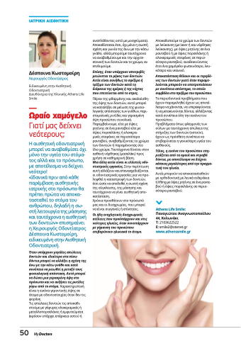 «Ιδανικά πριν από κάθε παρέμβαση αισθητικής ιατρικής στο πρόσωπο θα πρέπει πρώτα να αποκα- τασταθεί το στόμα του ανθρώπου, δηλαδή η σω- στή λειτουργία της μάσησης και ταυτόχρονα η αισθητική των δοντιών» επισημαίνει η Χειρουργός Οδοντίατρος Δέσποινα Κωστομοίρη, ειδικευμένη στην Αισθητική Οδοντιατρική.